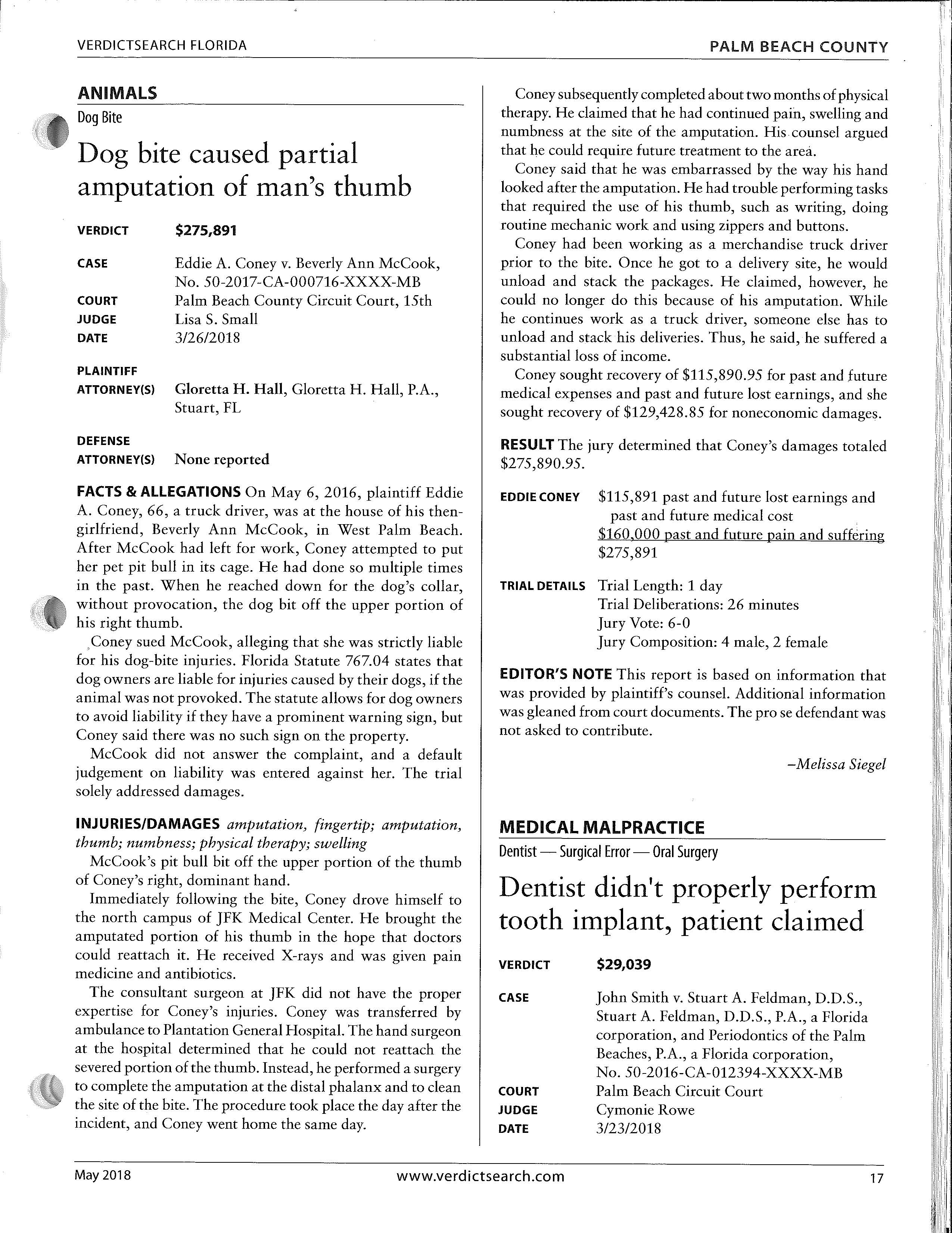 INJURIES/DAMAGES amputation, fingertip; amputation, thumb; numbness; physical therapy; swelling McCook's pit bull bit off the upper portion of the thumb of Coney's right, dominant hand. Immediately following the bite, Coney drove himself to the north campus of JFK Medical Center. He brought the amputated portion of his thumb in the hope that could reattach it. He received X-rays and was given pain Coney subsequently completed about two months of physical therapy. He claimed that he had continued pain, swelling and numbness at the site of the amputation. His counsel argued that he could require future treatment to the area.